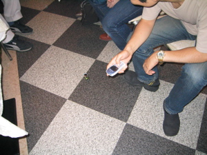 shimokenさんの手みやげが、携帯からBluetoothでコントロールするラジコン!みんな童心に帰ってはまってました。操作してるのは最近ラジコンにはまってる、のまさんです。